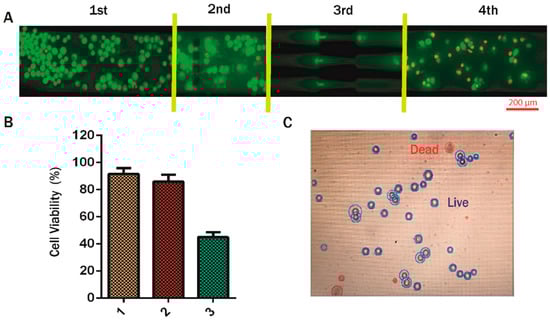As mentioned previously, the microchannel consisted of several obstructions, and the cells passing through the channel underwent deformation and pronounced morphological changes, decreasing the percentage of viable cells at the outlet []. Mesenchymal transformed MDA-MB-468 cells were collected by trypsinization before starting the experiment. The fluorescent images in Figure 3D confirmed the membrane integrity of EMT cells. For studying the viability, we performed AO/EtBr staining. Figure 7A shows the qualitative images of the cells at different sections of the channel. At the inlet, all of the cells were evenly stained with AO, with a few red dots indicating EtBr fluorescence due to dead cells. On passing the gaps of 10, 12, and 15 µm (between blockages), the cells were observed to be mostly alive. However, once the cells had passed through the 7 µm constriction and reached the outlet, almost 50% of the cells took up EtBr, confirming cell death. Similar events resulting in cell apoptosis have been observed during migration and invasion through blood capillaries smaller than their own diameter [,]. Quantitative estimation of the cell death during the flow was estimated by trypan blue staining, which further confirmed the presence of live cells at the outlet of the channel. Figure 7B indicates that around 50% of the cells were alive at the outlet.
