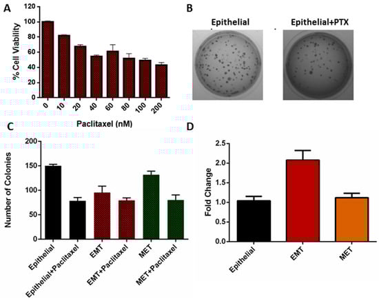 (A) MTT (3-(4,5-dimethylthiazol-2-yl)-2,5-diphenyltetrazolium bromide) assay results of the paclitaxel treatment of MDA-MB-468 cells for 48 h; (B) representative photograph of the colony formation assay of epithelial and drug-treated epithelial cells; (C) comparison of the number of colonies formed by the paclitaxel-treated epithelial, EMT, and MET cells with their respective controls; (D) real-time PCR assay results showing MDR-1 expression in epithelial, EMT, and MET cells.