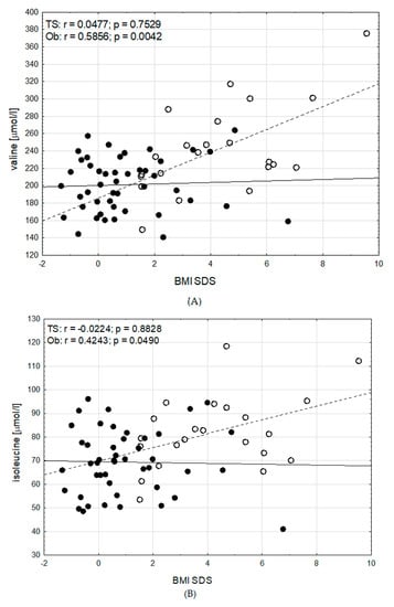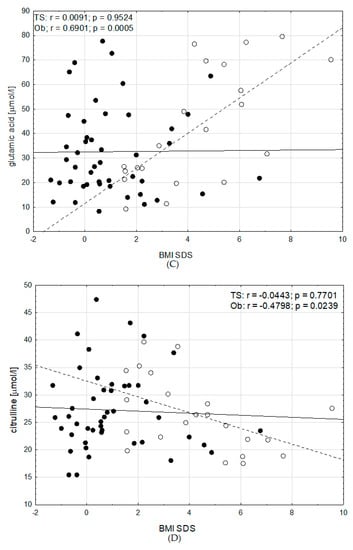 We analysed correlations between BMI SDS and amino acids. There were the same relations between amino acids and BMI SDS in girls with and without GH therapy, therefore we checked correlations between BMI SDS and amino acids in all patients with TS, regardless of the GH hormone therapy. We found a strong significant correlation between valine, isoleucine, leucine, phenylalanine, arginine, tyrosine, glutamic acid, citrulline and alanine concentrations, and BMI SDS in the patients with obesity (r = 0.59, p < 0.005; r = 0.42, p < 0.05; r = 0.58, p < 0.005; r = 0.43, p < 0.05; r = 0.48, p < 0.03; r = 0.54, p < 0.01; r = 0.69, p < 0.0006; r = −0.48, p < 0.03; r = 0.51, p < 0.02; respectively). In contrast, there was no correlation between these amino acids and BMI SDS in girls with TS (Figure 2 and Figure 3). Glycine correlated significantly and negatively with BMI SDS, both in girls with obesity (r = −0.67, p < 0.0008) and in girls with TS (r = −0.31, p < 0.05) (Figure 3).