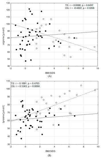 Correlations between non-essential amino acid concentrations: (A) arginine, (B) tyrosine, (C) glutamic acid, (D) citrulline, (E) alanine, (F) glycine, and BMI SDS in girls with TS (• and ━) and girls with Ob (○ and - - -).