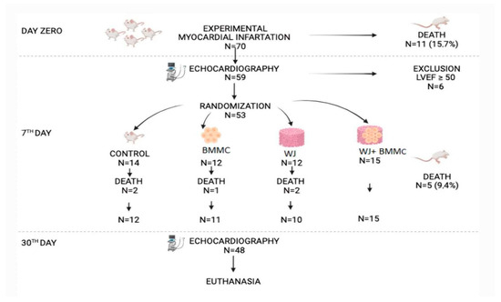 Seventy rats participated in this study, all of which underwent experimental infarction. Following this procedure, 11 animals died (15.71%). On the seventh day of the experiment, echocardiography was performed, and six animals had an ejection fraction >50%; therefore, they were excluded from this study and euthanized. Fifty-three animals were randomly divided using a paper draw, and the four study groups were subjected to biomaterial implantation or sodium chloride (control). Five animals did not survive the procedure (mortality rate of 9.43%), and 48 animals were followed without complications for 30 days until euthanasia at the end of the experiment. The groups were divided as follows: control group (n = 12), CT group (n = 11), WJ group (n = 10), and BMMC + WJ group (n = 15).