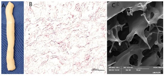 After decellularization, (A); Macroscopic observation of decellularized Wharton’s Jelly (WJ), which were evaluated with hematoxylin–eosin (HES) staining of paraffin-embedded sections (scale bar = 200 µm), (B); The structures were characterized with scanning electron microscopy (SEM) (scale bar = 100 µm), (C).