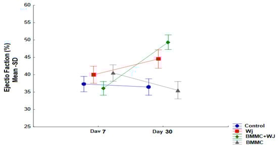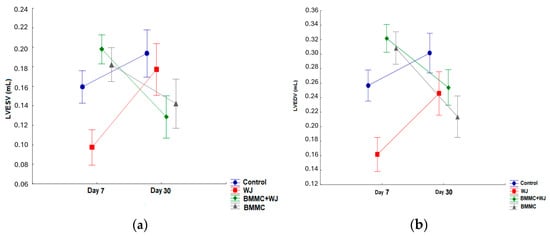 In the comparison within each group, between day seven and thirty, only the BMMC + WJ group showed a statistical difference (p = 0.014) between the initial and VESV, —left ventricular end-systolic volume—and LVEDV—left ventricular end-diastolic volume (Figure 4).