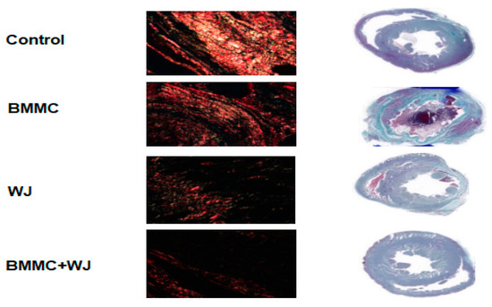 Infarct collagen content assessment after 30 days. Histopathological analysis using Picrosirius Red and Gomori’s trichrome staining performed thirty days after experimental infarction in the control group BMMC, WJ, and BMMC+ Wj. WJ: Wharton’s Jelly; BMMC: bone marrow mononuclear stem cells. Magnification 200×.