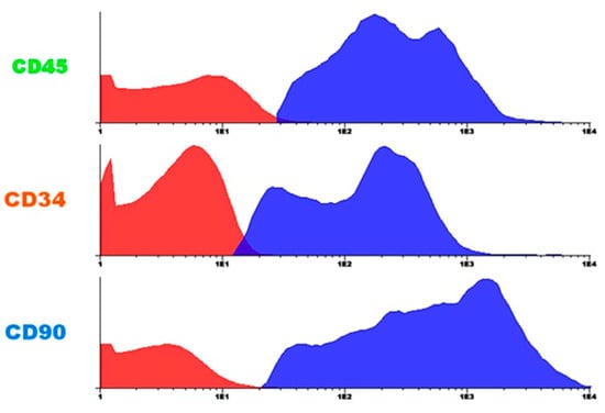 Cells were washed and incubated with a blocking solution of PBS containing 1% normal rat serum for 10 min. Following this, cells were exposed to saturating concentrations of fluorochrome-conjugated antibodies for 30 min at 4 °C in the dark, then washed thoroughly. The antibodies used for analyzing human cell-surface markers included anti-CD34, anti-CD45, anti-CD105, anti-CD90, and anti-CD73, as specified in the Stem Kit (Beckman Coulter, Krefeld, Germany), according to the manufacturer’s recommended concentrations. Mouse IgGκ1 isotype controls (5 μg/mL, BD Pharmingen) were used to confirm the specificity of the staining. The samples were analyzed using a FACS Calibur system (BD Biosciences, San Jose, CA, USA), with data processing carried out using FACS CompTM software (v 4.1) (FlowJo LLC, BD, Franklin Lakes, NJ, USA).