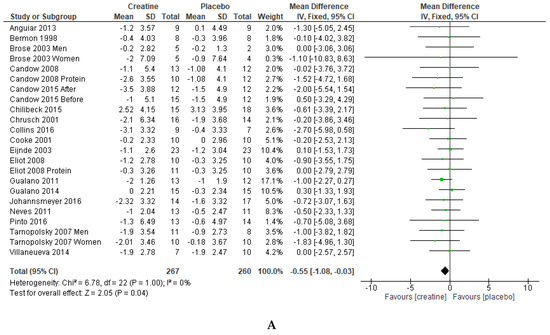 Articles were selected for full-text review if they met the following criteria: (i) randomized controlled trial where participants were allocated to a creatine (≥2 grams per day) or a placebo treatment condition and resistance training; (ii) the mean age was ≥50 years; (iii) intervention duration ≥five-weeks of ≥twice per week of resistance training (to provide sufficient time and stimulus to demonstrate observable changes in fat mass); and (iv) include either absolute fat mass (kg), body fat percentage (%), or body mass changes (kg) over time. We included studies that combined creatine with other nutritional supplements (e.g., whey protein), but also ran our meta-analyses without these studies to determine whether they influenced the final outcome measures. If the outcome data was not able to be extracted, authors were contacted for missing information. Data extracted included pre- and post-training means and standard deviations (SD) or change scores for outcome variables and SDs for the change scores. When pre- and post-training means were extracted, change scores were calculated as post-training mean subtract pre-training mean. SDs for the change scores were estimated from pre- and post-training SDs (SDpre and SDpost) using the following equation derived from the Cochrane Handbook for Systematic Reviews of Interventions:
