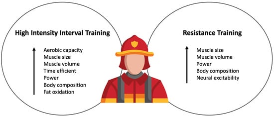 Interval training, specifically, high-intensity interval training (HIIT) is a modality which improves both the cardiovascular and musculoskeletal systems [,]. Interval training consists of repeated bouts of high-intensity exercise paired with bouts of recovery [] and is often deemed as a time-efficient exercise modality [,]. A unique aspect of HIIT is that it can be completed using cycle- or running-based training [,]. The little time involved and enjoyment of partaking in HIIT may suggest that it is an appropriate modality for previously sedentary individuals []. In addition to HIIT, resistance training is another advantageous exercise modality. Resistance training has been shown to improve functional movement, performance, strength, and cardiometabolic health [,]. Both training modalities (HIIT and resistance training) fit within the scope of the previously mentioned NFPA 1583. Aerobic training or endurance training may not be the most feasible for improving the cardiovascular and musculoskeletal systems while on-shift, due to the significant time requirements of this exercise modality. Also, endurance training may not meet the requirements of NFPA 1583 such as metabolic conditioning and muscular resistance. Potential benefits of HIIT and resistance training are explained in Figure 2.