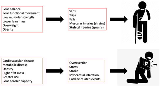 The literature shows several mechanistic links between health and performance variables and both non-fatal and fatal injuries in the fire service. Poor body composition and neuromuscular performance can impact functional movement on the job, leading to higher rates of musculoskeletal injuries. In addition, cardiometabolic disease and poor body composition are associated with higher levels of physiological stress and cardiac events in the fire service.