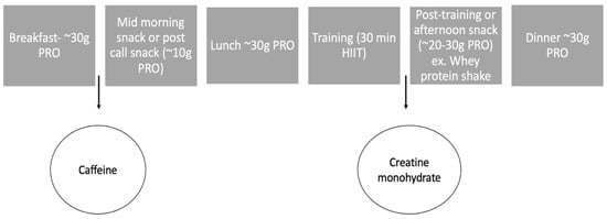 An example of implementing on-shift nutritional strategies and training for a 75 kg firefighter. Following the 1.4–2.0 g/kg protein recommendation, the range of protein intake should be 105–150 g/day. The assumption is the firefighter eating at normal mealtimes. It is suggested that caffeine is consumed in the morning to promote alertness, while consuming a snack mid-morning or post-call. Caffeine may help with grogginess as many firefighters note poor sleep quality. In the afternoon, the firefighter is partaking in 30 min of high-intensity interval training followed by protein consumption to help with satiety and recovery. To help meet training and body composition goals, creatine monohydrate should be added daily. Adequate protein consumption should help meet recovery needs based on training and call-volume as well as promote satiety throughout the shift.