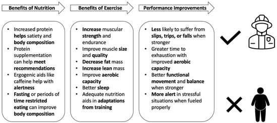 This current work attempted to summarize the literature and offered feasible and effective strategies for firefighters to adopt while on-shift. Secondly, this review highlighted implementation strategies for training as well as practical nutrition recommendations for firefighters to incorporate on-shift. The research regarding exercise and dietary interventions in firefighters is limited; however, results from a few studies show benefits for firefighter health, wellness, and occupational performance (Figure 5).