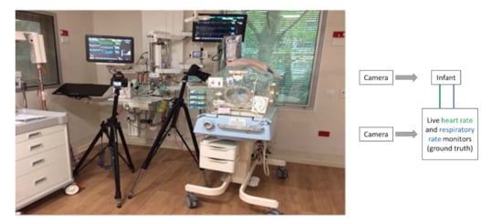 - Gibson, K.; Al-Naji, A.; Fleet, J.; Steen, M.; Esterman, A.; Chahl, J.; Huynh, J.; Morris, S. Non-contact heart and respiratory rate monitoring of preterm infants based on a computer vision system: A method comparison study. Pediatric Res. 2019, 86, 738–741. [Google Scholar] [CrossRef] [PubMed]