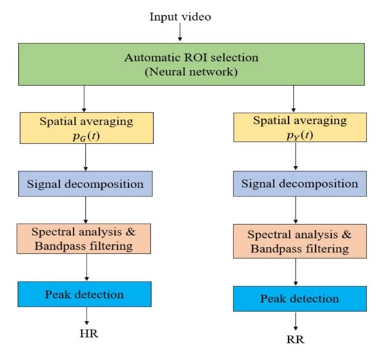The overall system includes several image and signal processing techniques, such as automatic ROI selection, spatial averaging, signal decomposition, spectral analysis, band-pass filtering, and peak detection, as shown in Figure 2.