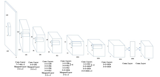 YOLO network architecture (adapted from []). The YOLO network has 24 layers followed by two fully connected layers.