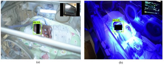 Automatic ROI selection using the YOLO neural network. The detected ROIs were shown in green bounding boxes. (a) Infant under normal light, (b) infant under blue light.
