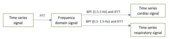 A spectral analysis technique based on the Fast Fourier Transform (FFT) was used to transform the time series cardiac and respiratory signals from the time domain to the frequency domain (see Figure 5). After that, two ideal band-pass filters were applied at 1.5 to 3 Hz, which correspond to the heart pulse range (90–180 beats/min), and 0.3 to 1.5 Hz, corresponding to the breathing range (18–90 breaths/min), to obtain the frequency band of interest. The inverse FFT was then applied to the filtered signals to obtain the time series cardiorespiratory signals.