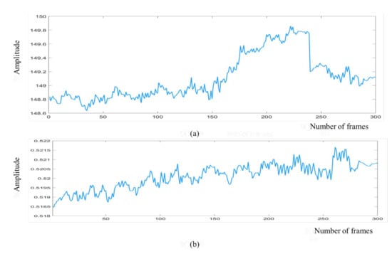Colour-based and motion-based methods were used to extract raw cardiac and respiratory signals, respectively. A colour variation in human skin is observed, as haemoglobin in blood absorbs illumination more than surrounding tissue, which may not be visible with the naked eye but can be detected by a video camera []. The colour changes reflect the blood volume changes in the microvascular tissue bed under the skin due to variation in pulsatile blood flow during each cardiac cycle. The cardiac signal can be extracted using this principle. Using the green channel of RGB colour space, a raw cardiac signal was extracted by averaging the brightness pixel values of the selected ROI as given in Equation (1). The purpose of this was to minimize noise improve the signal to noise ratio.