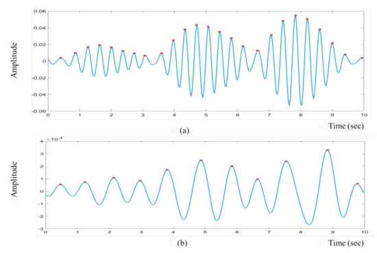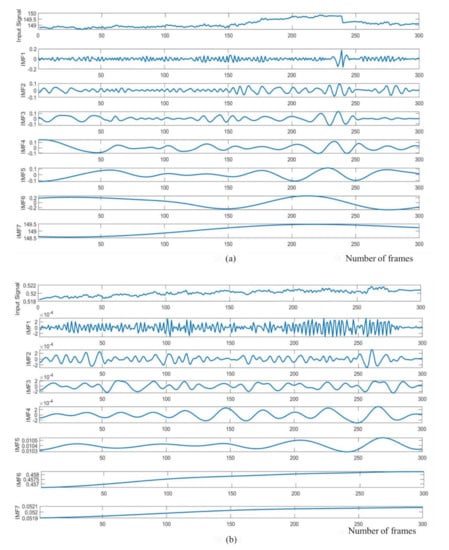 EMD is a multiresolution signal decomposition technique for a complex and multi-component signal representation developed by Huang et al. []. It is commonly used to remove noise artefacts from biomedical signals. The EMD uses the local temporal and structural characteristics of a non-linear and non-stationary signal and adaptively decomposes it into a set of stationary modes in different time scales, called intrinsic mode functions (IMFs). IMF is commonly used to remove noise artefacts from biomedical signals, such as the removal of noise artefacts from ECG data [], the removal of noise artefacts from electromyogram data [], the removal of muscle artefacts from electroencephalogram data [], the removal of tissue artefacts from respiratory signals [], and the removal of illumination variations from photoplethysmography signal [].