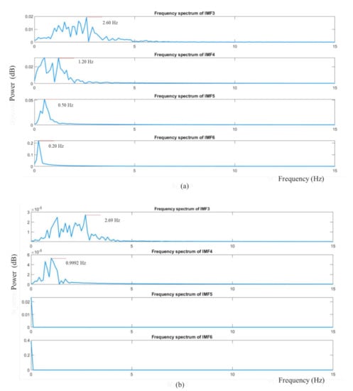 The frequency spectrum of decomposed IMF3, IMF4, IMF5 and IMF6. (a) Cardiac signal (b) respiratory signal.