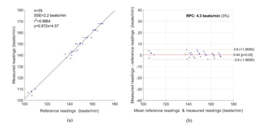 To evaluate the proposed non-contact system, we considered statistical methods based on the Pearson correlation coefficient (PCC), linear regression, Bland–Altman plot, root mean square error (RMSE) and mean absolute error (MAE). We considered a total sample size, n = 35. Figure 11a shows a strong correlation between the reference and measured data with PCC of 0.9864. As shown in the Bland–Altman Plot in Figure 11b, the reproducibility coefficient (RPC) was 4.3 beats/min (3%), the mean bias was 0.44 beats/min, the lower and upper limits of agreement were −3.9 and +4.8 beats/min. For HR, the RMSE was 2.22 beats/min, and the MAE was 1.80 beats/min.