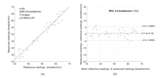 Figure 12 represents the statistical measurement for RR. As shown in Figure 12a, a strong correlation exists between the reference and measured data with a PCC of 0.9453. Figure 12b represents the Bland–Altman plot with a mean bias of 0.71 breaths/min, a lower and upper limit of agreement of −4.5 and +5.9 breaths/min, and an RPC of 5.2 breaths/min. For RR, the RMSE and MAE were 2.69 and 2.13 breaths/min, respectively.