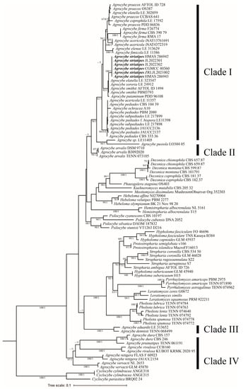 In this study, a multi-gene phylogenetic analysis was carried out based on 95 specimens, including 50 specimens of 23 Agrocybe species. Phylogenetic results enable the division of the current Agrocybe into four main clades, which coincided with previous research [,,]. Clade I contains the proposed new species and the type species A. praecox, as well as most of the Agrocybe species. Clade II contains only species A. arvalis, which is nested at the sister position with Clade I without statistics supporting the values. The Clade IV is located at the base of the phylogenetic tree and comprises five strongly supported species (97 BS/1 PP). Regardless, the molecular analysis supports A. striatipes as a new species, and this is also supported by its morphological characteristics. To resolve the taxonomic problem of polyphyletic Agrocybe, the taxonomic system for those related taxa may change in the future. However, no matter how the taxonomic system changes, A. striatipes as belonging to Agrocybe will not change due to it being closely clustered with type species A. praecox within clade I in the phylogeny (Figure 1) [].