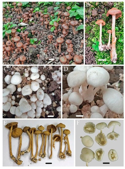 The macromorphological characters of Agrocybe striatipes in cultivation. (A,B,E) holotype (HMAS286942); (C,D,F) specimen HMAS286943 with pure-white fruiting bodies. Scale bar: (A–C) = 2 cm; (D) = 1 cm, (E,F) = 2 cm.