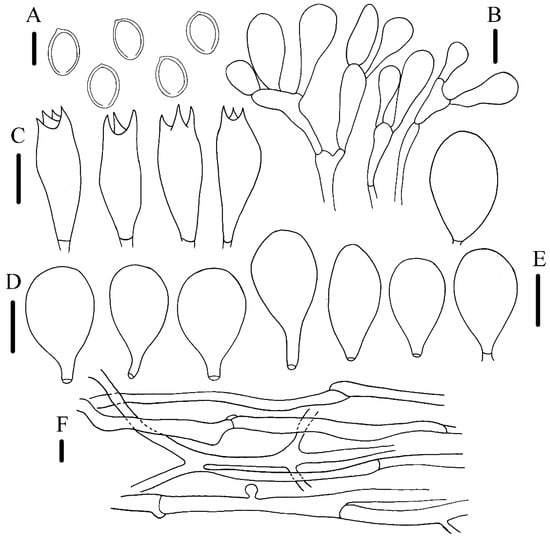Micromorphology of A. striatipes (HMAS486942, holotype). (A) basidiospores; (B) pileipellis hyphae; (C) basidia; (D,E) cheilocystidia and pleurocystidia; (F) stipitipellis hyphae. Scale bar: (A–F) = 5 μm.