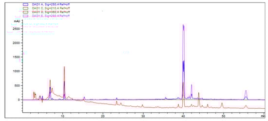 The dry encarpium (200 g) was extracted repeatedly with 95% ethanol 500 mL three times, and the organic solvent was evaporated to dryness under a vacuum to afford the crude extract (3.2 g), which was distributed between water and EtOAc to afford the two fractions. They were analyzed by HPLC. The water fraction was dissolved in DMSO-d6 and analyzed by 1H NMR, which revealed that the water fraction mainly contained oligosaccharides and amino acids (Appendix A Figure A1). We found that there was a main compound with a retention time of 40.0 min; other peaks with similar retention times have the same UV absorption, which were as shown in Figure 4. The main compound (3.0 mg) was purified by the same HPLC condition. It was identified as ergosterol by an analysis of 1H and 13C NMR contrast the reference (Appendix B Figure A2 and Appendix C Figure A3) []. Ergosterol, the major product of mycosterol biosynthesis, is an important component of fungal cell membranes that maintain membrane structural integrity, permeability, and fluidity, which can promote the absorption of calcium and phosphorus in the human body. It is one of the good sources of exogenous vitamin D2 in the human body and is often used to improve rickets, osteomalacia, and osteoporosis caused by vitamin D deficiency in infants and elderly people [].