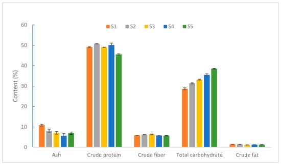 As shown in Figure 1, the developmental process of the S. rugoso-annulata fruiting body can be divided into five stages, namely, S1 (the button stage), S2 (the gill formation stage), S3 (the early maturity stage), S4 (the maturity stage), and S5 (the parachute stage), in chronological order. The ash content reaches the highest level at the button stage and decreases significantly afterward. The total carbohydrate content increases continuously throughout the entire developmental process. The crude protein content remains relatively stable but declines during the parachute stage. The crude fiber and crude fat content did not vary much at each stage [,]. The crude protein content of S. rugoso-annulata was significantly higher in the unopened stage than in the opened stage []. S4 and S2 are the stages when S. rugoso-annulata exhibits a higher overall nutritional quality, providing a reference for the timely harvesting of S. rugoso-annulata [].