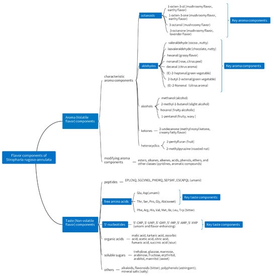 Flavor components in S. rugoso-annulata (data obtained from references [,,,,,]).