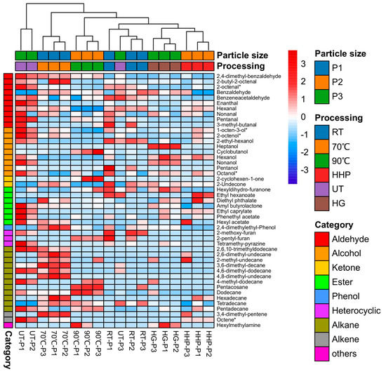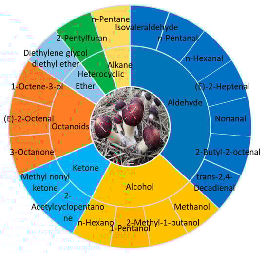 The characteristic aroma components profile of S. rugoso-annulata fruiting body consists of 19 compounds common to fresh and dried mushrooms, which mainly belong to aldehydes, alcohols, ketones, and octanoids (Figure 3) []. The key aromatic components that contribute the most to the aroma of S. rugoso-annulata are aldehydes, including isovaleraldehyde, hexanal, etc., and octanoids, including 3-octanone, 3-octanol, 1-octene-3-one, 1-octen-3-ol, etc. Aldehydes were the most abundant both in number and contents [,,]. Octanoids give S. rugoso-annulata its mushroomy and earthy smell. 1-octen-3-ol, also known as Fungusol, is a compound found in many mushrooms and is primarily responsible for the characteristic mushroomy smell []. The strong earthy odor in fresh S. rugoso-annulata mainly results from the odor of 3-octanone and 1-octen-3-one []. Hexanal in aldehydes imparts a grassy aroma and isovaleraldehyde imparts a malty and fruity aroma, while heterocyclic compounds such as furans, pyrazines, and pyridines give the burnt smell during the process of heating [,,,,].