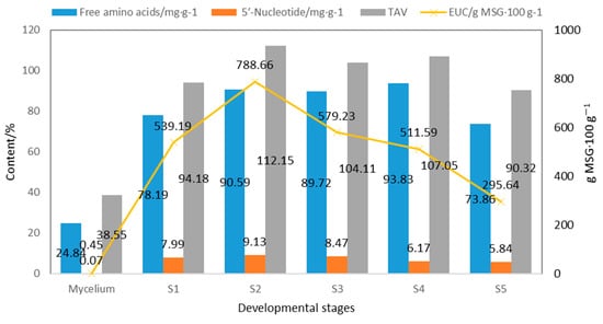 As shown in Figure 4, the content of free amino acids (2.48%) and 5′-nucleotides (0.0067%) in fermented mycelium is obviously lower than in the fruiting body [], resulting in an almost negligible umami taste (EUC) in the fermented mycelium. The total content of free amino acids, 5′-nucleotides, EUC, and TAV in the fruiting body showed a trend of first increasing and then decreasing [].