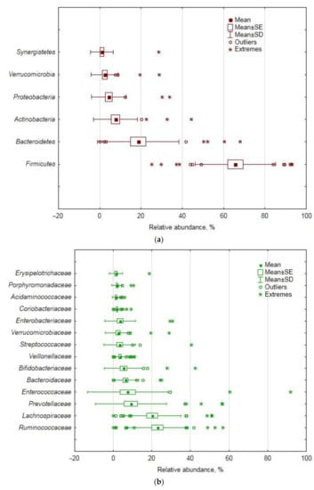In the studied cohort of GSD-afflicted female patients, the Firmicutes phylum was the ultimate dominant in the fecal bacteriobiome, with Bacteroidetes and Actinobacteria being second and third in the ranking of abundance. In this aspect, our cohort differed from a Chinese one, where Proteobacteria, instead of Actinobacteria, were found to be third in abundance, and Bacteroidetes were almost twice as abundant as in our cohort [22]. Moreover, in our cohort, the Firmicutes relative abundance was markedly higher, as compared with the Chinese cohorts [5,21]. The apparent discrepancy is most likely due to the fact that one third of the Chinese cohort were males, whereas ours was a purely female one; and to the difference in diet [23]. As for the biodiversity indices, however, the ones calculated in our study agree well with the indices describing the fecal bacteriobiome of a Chinese cohort of GSD patients [21].