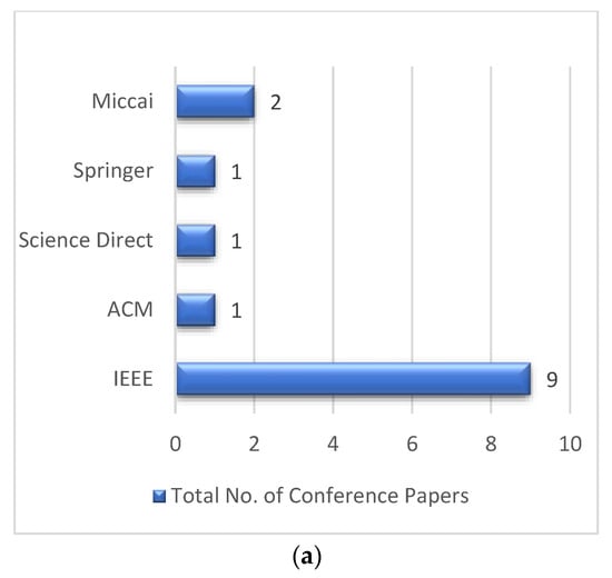 The 55 selected papers were collected from different publication channels, which include journals, conferences, and symposiums. Figure 3c showed the total number of papers selected in this study. The selected conference papers were collected from different repositories. Bar graphs were used to represent different repositories such as IEEE, ACM, Springer, Miccai, and Science Direct, as shown in Figure 3a. The distribution of selected journal papers from different repositories are shown in Figure 3b.