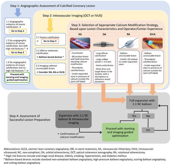 Detection and characterization of coronary calcium is an important first step. However, it should be recognized that every modality of calcium assessment has its relative advantages and disadvantages. While coronary angiography has a high positive predictive value for detecting calcification, it has only low to moderate sensitivity compared to IVUS or OCT []. Therefore, operators should have a low threshold for performing intravascular imaging to detect calcium, especially in an at-risk population such as those having hypertension, diabetes, renal failure or a history of smoking. Calcium severity (Table 2) and characteristics (intimal vs. medial calcification) should be assessed. The decision regarding which modality of calcium modification to use should be guided based on findings of intracoronary imaging, lesion characteristics, and device availability. The decision should also be guided based on operator experience as higher operator volume is associated with improved PCI outcomes for certain modalities (such as RA) that may require a longer learning curve []. OA is preferred in the presence of superficial and deep calcium, long calcified lesions, large caliber arteries, and aorto-ostial lesions. OA is also preferred when there is more than one target lesion to be treated with a discrepancy in reference vessel diameters (e.g., 2.5 mm left anterior descending artery and 4.0 mm left main coronary artery) because of the ability to treat at 80,000 and 120,000 rpm with the same crown and be able to achieve contact with vessel wall for plaque modification. RA or ELCA is preferred in balloon uncrossable lesions. IVL is preferred in the presence of focal severely calcified lesions, bifurcation lesions with severe calcification, and large caliber arteries. IVL or ELCA is preferred in cases of ISR due to an underexpanded stent in the presence of calcium outside the stent. Additionally, if there is still a lack of complete expansion of a 1:1 NC balloon after atherectomy, IVL is recommended to further modify the plaque before stent placement. IVL is expected to become a predominant treatment modality for many calcified coronary lesions in the future due to its ease of use and low risk of major complications associated with other technologies.