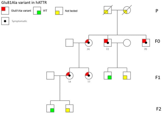 Hereditary transthyretin amyloidosis (hATTR) is a rare disorder with a largely variable worldwide prevalence, and it is caused by autosomal dominant mutations in the transthyretin (TTR) gene, located on chromosome 18 []. TTR is a protein synthesized in the liver, pancreas, choroid plexus, and retinal pigment epithelium, which has the primary function of transporting the thyroid hormone thyroxine in the plasma and cerebrospinal fluid []. Pathogenesis of hATTR is due to the aggregation of misfolded proteins causing extracellular deposition of amyloid-insoluble fibrils and local tissue damage []. Unfortunately, the diagnosis of hATTR is challenging, and it can be delayed for many years, leading to disability and mortality. It can present with length-dependent sensori-motor axonal polyneuropathy (PN-hATTR), and/or infiltrative cardiomyopathy (CM-hATTR), variably associated with autonomic dysfunction, juvenile ocular disorders, and kidney disease []. Hence, clinical phenotypes are heterogeneous and subtle, often leading to very difficult diagnoses. The global prevalence of hATTR is estimated to be around 1/450,000 people (range 1/120,000–830,000), with a total number of confirmed cases of 10,186 people []. More than 150 mutations in the TTR gene have been described, and every mutation shows a distinct phenotype, including variable heart and nerve involvement, age of onset, disease progression, and mortality [,]. The Val30Met variant of the TTR gene was the first to be identified and is considered the most frequent in both endemic and non-endemic areas, being responsible for about 70% of hATTR [,]. In 2015, Mazzeo et al. reported a hATTR prevalence of 8.8/1,000,000 in Sicily; interestingly, the authors did not report the common Val30Met variant, describing only three TTR variants (Glu89Gln, Phe64Leu, Thr49Ala) []. However, recently, four further mutations of the TTR gene have been reported in Sicily (His90Asn, Val122Ile, Ser77Phe, Val20Ala) [,]. In general, correlations between genotype and phenotype in hATTR are often difficult due to the heterogeneity of clinical onset, progression, and prognosis. With this paper, we describe a family carrying the Glu61Ala variant, which had been previously reported only once, in a case of CM-hATTR [].