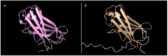Comparison of 3D models of the wild-type (A) and Glu61Ala-mutated (B) TTR protein. Models adapted from PDB code 4TLT. White arrows indicate the amino acid position 61.