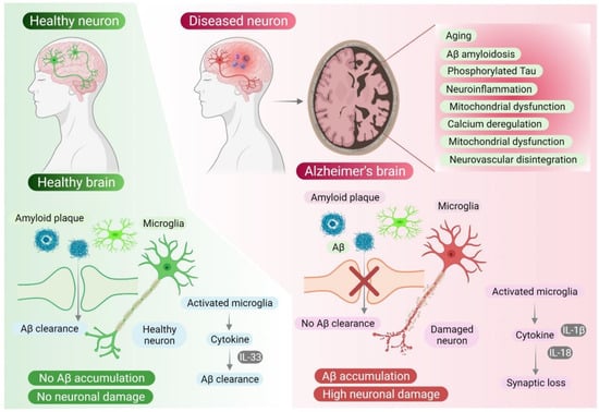 Several hypotheses have been proposed to define the etiology of AD based on observed clinical, neuropathological features: cholinergic hypothesis, amyloid cascade hypothesis, and tau propagation hypothesis []. Some other potential hallmarks of Alzheimer’s dementia are mitochondrial dysfunction, calcium deregulation, neurovascular disintegration, neuroinflammation, metal ion dyshomeostasis, and defective lymphatic system [,,,]. However, the most well-known and defining features representing AD are Aβ accumulation, phosphorylated tau aggregation, and neuroinflammation [,,]. In Figure 1, we have summarized the various AD hallmarks in the Alzheimer’s brain and have shown how excessive amyloid deposition leads to neuronal disease. As mentioned above, the amyloid cascade hypothesis postulates that APP metabolism and Aβ42 accumulation are the most important triggering factors for AD pathogenesis []. This hypothesis holds the accumulation of Aβ peptide responsible for the eventual loss of synapses and neuronal cell death [,]. An increasing body of evidence supports toxic Aβ as the primary cause of pathology, which can initiate neuronal dysfunction by inducing granulovacuolar degeneration, astrocytosis, microgliosis, and deficient endosomal transport when deposited extracellularly []. Moreover, the Aβ can also deposit around the small blood vessels of the brain, leading to the development of cerebral amyloid angiopathy (CAA), a common neuropathological condition usually occurring in AD patients, probably caused by the failure of Aβ clearance [].