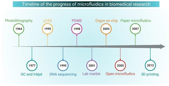 Timeline of the progress of microfluidics in biomedical research. Abbreviations: GC, gas chromatography; µTAS, micro total analysis system; PDMS, Polydimethylsiloxane.
