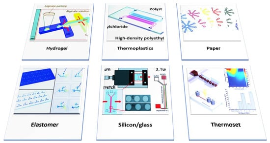 Schematic representation of the materials used for the fabrication of microfluidic chips. Hydrogels made up of natural materials, i.e., alginate, serve as matrices for culturing of cells in microfluidic chips. Thermoplastics such as polyvinyl chloride, polystyrene and high-density polyethylene are commonly used in fabrication. Moreover, the typical white color of paper makes it well suited for color-based detection methods in most assays and used for multiple bioassays in the form of origami-inspired folding devices. Elastomer is generally made up of PDMS. The glass-based microfluidic channel is made by the laser direct writing method. Thermoset, polyester-based, is a droplet-based device that can be used at different flow rates with three different oils.
