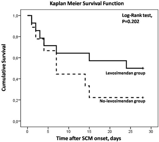 Kaplan–Meier Survival curves showing the relation between 28-day survival and treatment with levosimendan or not in septic cardiomyopathy.