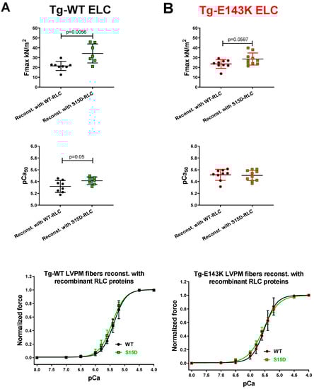Force measurements in skinned LVPM from Tg-WT ELC (A) and Tg-E143K ELC (B) mice reconstituted with recombinant RLC proteins. Maximal force (top panels), Ca2+-sensitivity of force (middle panels), and force–pCa relationship (bottom panels) were measured in LVPM fibers from Tg-WT ELC and Tg-E143K mice. The fibers were depleted of endogenous RLC and reconstituted with recombinant WT-RLC (black-filled symbols) and S15D-RLC (green-filled symbols) proteins. Data are the average ± SD of n = 7–8 reconstituted LVPM fibers from Tg-WT ELC (2 animals-1F, 1M) and n = 9–10 reconstituted LVPM fibers from Tg-E143K ELC (3 animals-2F, 1M). Significance (p values) was calculated by Student’s t-test.