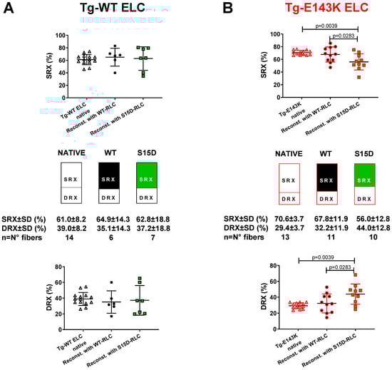 The SRX state of myosin assessed in LVPM fibers from Tg-WT ELC and Tg-E143K ELC mice reconstituted with recombinant WT and S15D RLC proteins.