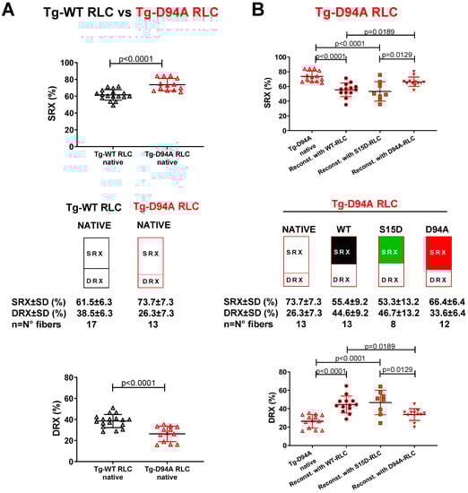 Summary of the SRX study performed on reconstituted LVPM fibers from the model of DCM, Tg-D94A mice. (A) SRX comparison between Tg-WT RLC and Tg-D94A RLC mice. (B) The proportion of myosin heads in the SRX (top) and DRX (bottom) states. LVPM fibers reconstituted with WT-RLC are shown in black-filled symbols, while those reconstituted with S15D-RLC are shown in green-filled symbols. D94A-RLC-reconstituted fibers are depicted with red-filled symbols. Data are expressed as mean ± SD of n = N° fibers: n = 13, 4 animals-3F, 1M for native Tg-D94A, n = 17, 5 animals-2F, 3M for Tg-WT native, and n = 8–13, 4 animals-1F, 3M for LVPM fibers from Tg-D94A reconstituted with RLC proteins. The significance was calculated by Student’s t-test (A) and one-way ANOVA with Tukey’s multiple-comparison test (B).