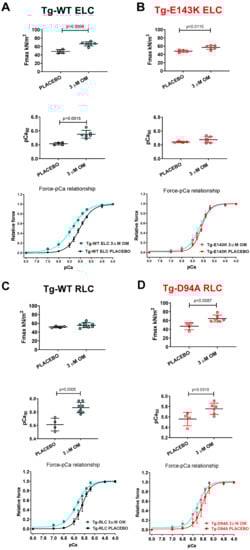 Contractile function in skinned LVPM fibers from Tg-WT ELC (A), Tg-E143K ELC (B), Tg-WT RLC (C), and Tg-D94A RLC (D) mice treated with 3 µM OM versus placebo (pCa 8 buffer). Maximal force (top panels), Ca2+-sensitivity of force (middle panels), and force–pCa relationships (bottom panels) were measured in fibers treated with 3 µM OM (cyan-filled points) compared with placebo (pCa 8 solution) (clear points). Data are the average ± SD of n = 4–8 fibers (1–2 mice) per group. p values were calculated by Student’s t-test.