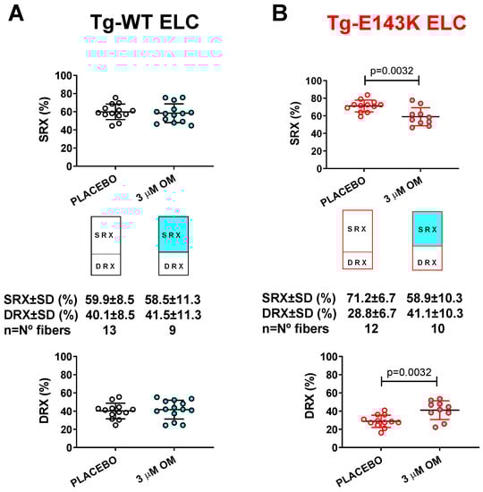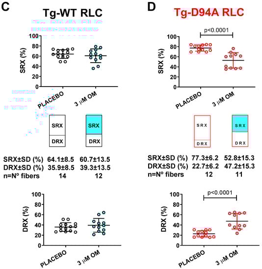 Next, we tested the effect of treatment with 3 µM OM of LVPM fibers from Tg RCM and DCM mouse models and their respective Tg-WT mice and the balance between the SRX and DRX states in OM- versus placebo- (pCa 8 buffer) treated fibers (Figure 5). Despite the significant impact of OM on muscle contraction in transgenic WT-ELC and WT-RLC mice (Figure 4A,C), no effect upon treatment with OM versus placebo was observed in relaxed muscle fibers, which maintained their SRX-to-DRX ratios (Figure 5A,C, Table 5). However, LVPM fibers from RCM-ELC and DCM-RLC mutant mice demonstrated a significantly lower % SRX heads with OM treatment compared with placebo-treated fibers (Figure 5B,D, Table 5). As we showed previously, both models, Tg-E143K ELC and Tg-D94A RLC, favored the energy conservation SRX state, where myosin heads cycled ATP with highly inhibited rates [,]. In both models, treatment with 3 µM OM caused a switch from the SRX to the DRX state, where more myosin heads became disordered, relaxed, and readily available for interaction with actin and force production (Table 5). These results indicated a drug-related rescue of the RCM-E143K ELC (Figure 5B) and DCM-D94A RLC (Figure 5D) disease phenotypes.