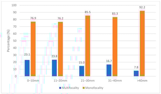 The association between multifocality and various clinicopathological parameters is exhibited in Table 3 and Figure 1. In patients with multifocality, the median size of the primary tumor mass was 20 mm, ranging from 6 to 70 mm. Conversely, in patients with monofocality, the median tumor size was 30 mm (range 3 to 125). Compared to patients with monofocal tumors, patients with multifocality had significantly smaller index tumors (p = 0.001). The rate of tumor size > 4 cm was statistically significantly higher in patients with monofocality compared to patients with multifocality (40.3% vs. 18.2%, p = 0.005). Additionally, multifocality was associated with a significantly higher rate of index tumors < 2 cm in comparison to monofocal cases (52.3% vs. 29.2%, p = 0.003).