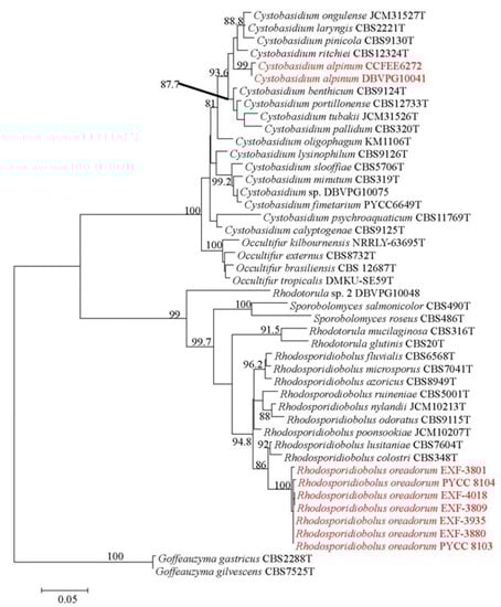 The resulting multilocus phylogenetic tree, generated using a GTR+G(4) model selected using the Akaike’s information criterion with a Maximum-likelihood approach, is shown in Figure 1. The backbone of the tree and branches of genera are well resolved and supported. The tree topology is concordant with the most recent phylogenetic studies on yeasts in Pucciniomycotina [] and on the genus Cystobasidium in particular [].