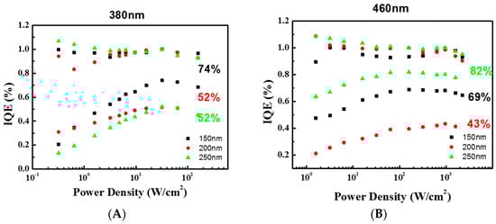 All the samples were analyzed by the power-dependent PL at 12 and 300 K. The measured quantum efficiency data were normalized by the maxima value at 12 K for all samples as IQE value of 100% and the peak value at 300 K was defined as the room temperature IQE value as shown in Figure 5A–D. As the power density was low, the IQE showed an obvious increasing trend as the power density increased. This could be due to the screening of the non-radiative recombination centers caused by the point defect. As the power density increased, the injected carriers would gradually compensate the point defects, leading to an increase in IQE value. This phenomenon was more significant when the measurement temperature was at room temperature, because the thermal agitation could provide energy to carriers to be trapped by the point defects. On the other hand, when the power density was very high, the IQE showed an obvious decreasing trend, which was identified as a notorious efficiency droop effect. As a result, a highest IQE value would be observed at specific pumping power density. Numerous reports have debated on the roots of droop, because the postponed onset of droop effect could increase the highest IQE value to be observed [40,41]. Here, we systematically showed the effect of different V-pits on the highest IQE values on different emission wavelength samples.