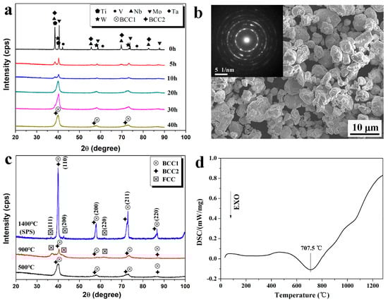 (a) XRD patterns of NbMoTaWVTi powders with different milling times; (b) SEM image and corresponding SAED pattern of the high entropy alloy (HEA) powders after 40 h of milling; (c) XRD patterns of ball milled powders heat-treated at 500 °C, 900 °C for 1 h, and bulk HEA after spark plasma sintering (SPS) at 1400 °C; (d) DSC curve of the HEA powders after 40 h of milling.